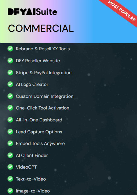 FE: DFYAI Suite Commercial$47Core platform access, DFY templates, AI content tools, site/funnel builder, email & social automation, commercial license.