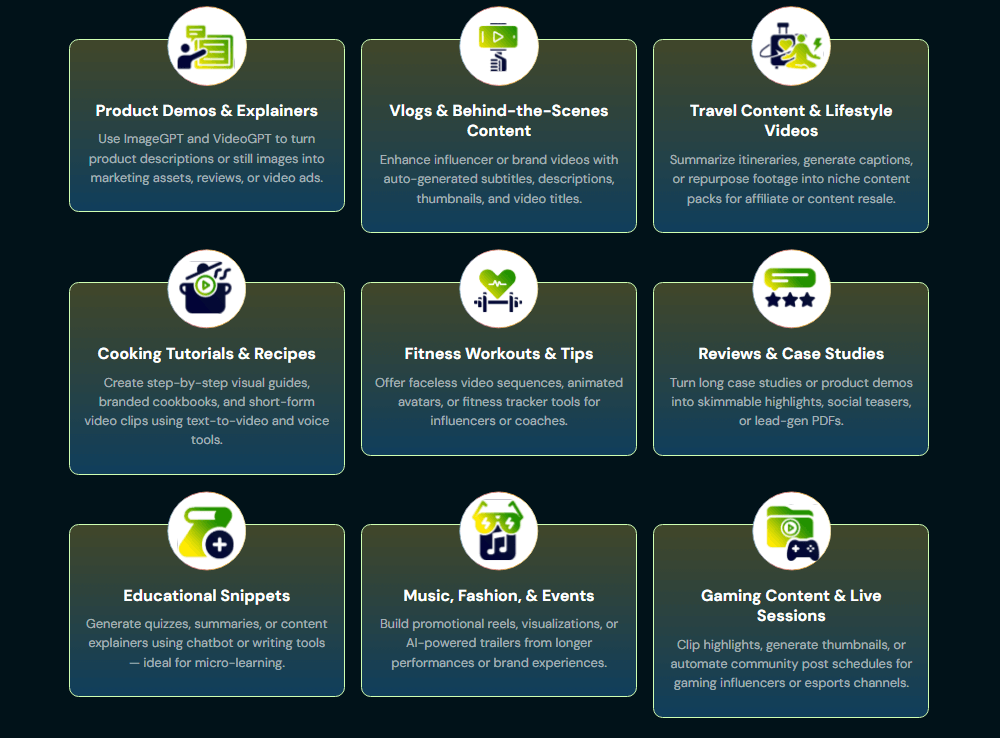 • YouTubers & content creators – Generate scripts, thumbnails/creatives, landing pages, and email follow-ups.