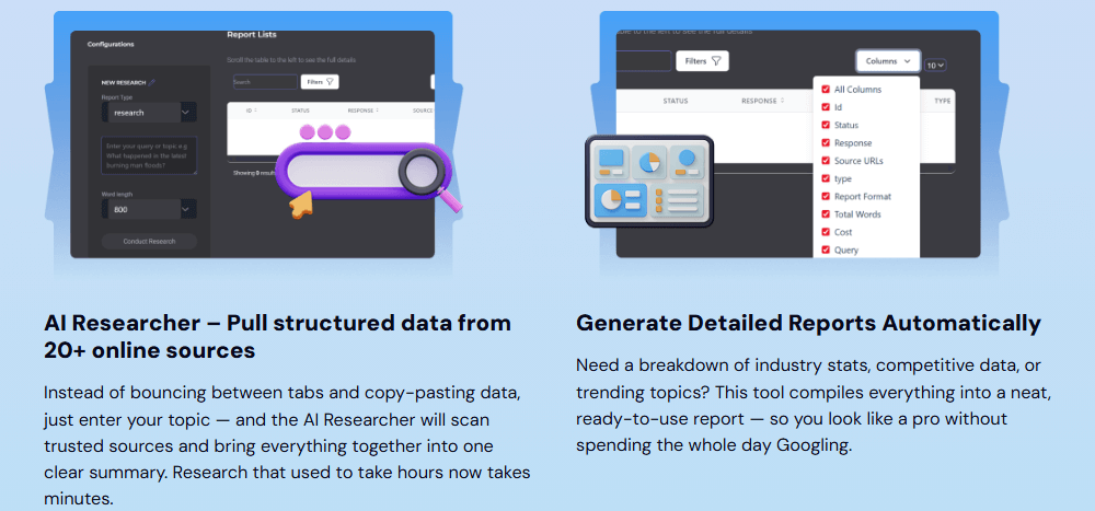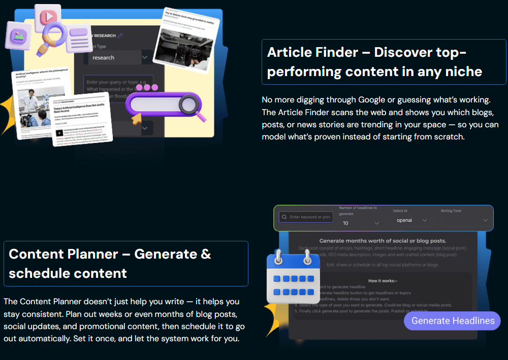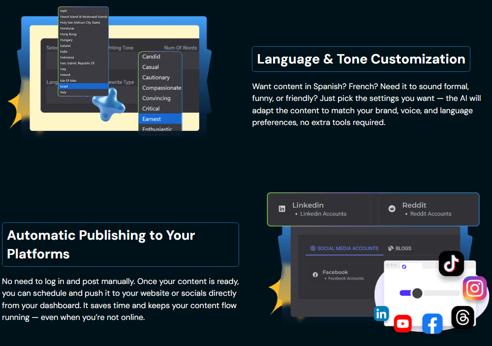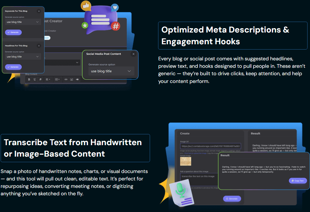 • AI-Powered Content Creation – Instantly generate articles, blog posts, product descriptions, ad copy, and video scripts.