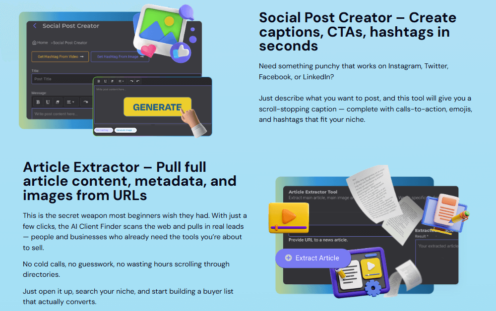 • Freelancers & agencies – Deliver websites, funnels, content, and social kits from one tool.