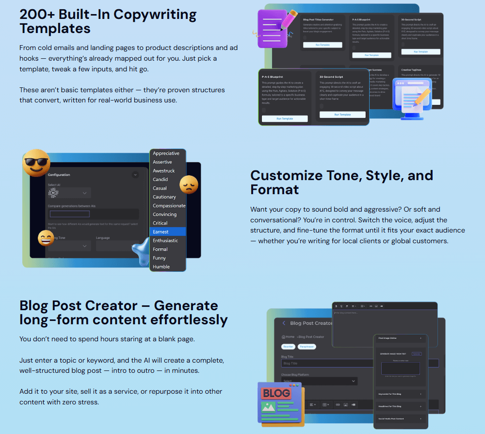 • Done-for-You Templates – Hundreds of customizable templates for websites, funnels, social media, and email campaigns.