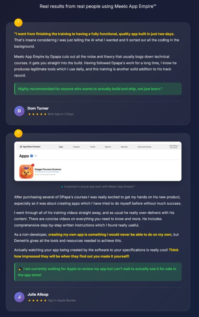 During the creation of this training, Demetris built and submitted multiple apps himself — using the same tools and process taught inside the program. Those real approvals and live apps act as proof that the system isn’t theoretical. It’s a method refined through trial, error, and iteration.