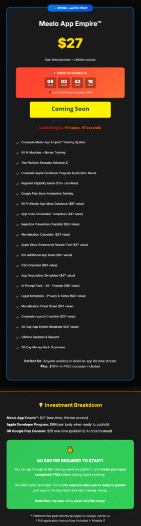 Many app courses stop at design concepts or vague monetization advice. Meelo App Empire goes further by documenting the entire lifecycle of an app business.